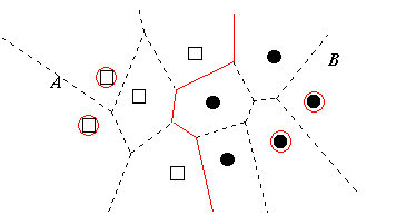 Although the decision boundary is rarely explicitly computed on practice for high dimension problems, it is clear that, having the decision boundary alone is sufficient to perform the classification of new objects. Hence the nodes of the Voronoi regions whose boundaries did not contribute to the decision boundary are redundant and can be safely deleted from the training set (see Figure 2.3).