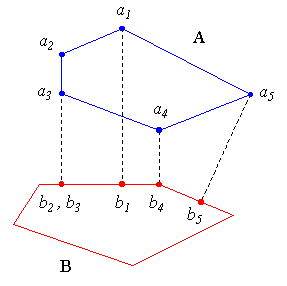Let bi be the closest point of B from a vertex a of A.  If µ is the moving direction (clockwise or counterclockwise) from bi to bi+1 then, for a complete cycle through all vertices of A, µ changes no more than twice.