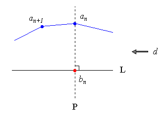 However, bn+1 can not be below L at the right of P : any point in that area is further from an+1 than bn. If there is no point of B on the left side of P, then bn+1 could only be at the same place than bn. Except for this case, bn+1 can not be neither on P, because any point on P below L is also further from an+1 than bn.